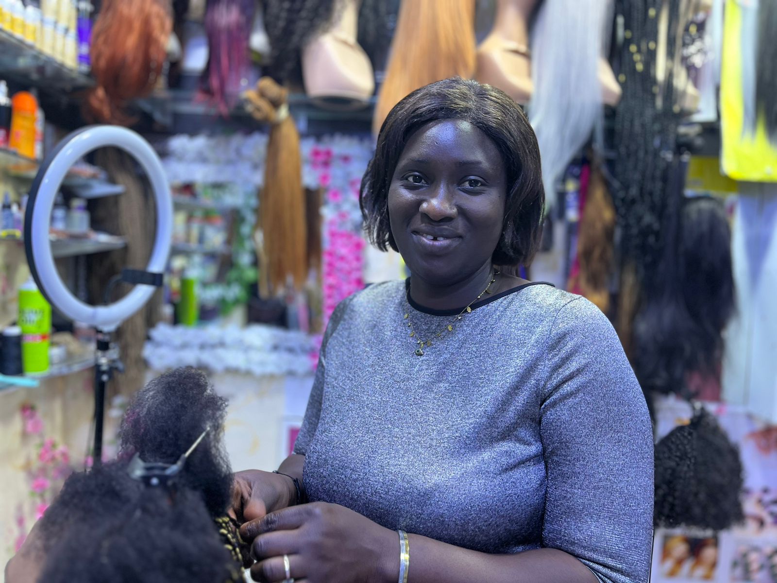 She explains further, “I get my products from Senegal. There are people who come with their cars, bringing accessories, wigs, shea butter, and all the items I sell here. I buy from them and sell it in my shop,” she continues, all while carefully applying eyelashes to her client, who listens intently.